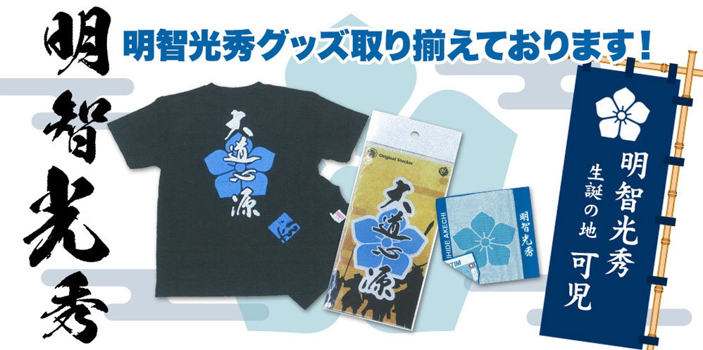 明智光秀の文字、家紋(桔梗紋)、辞世の句「大道心源」を記したTシャツやステッカー、タオルなど取り揃えております。
